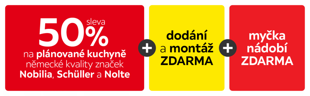 Sleva se vztahuje na nezávazně doporučenou spotřebitelskou cenu a platí jen při nákupu plánované kuchyně značek Nobilia, Schüller nebo Nolte v hodnotě nad 65.000 Kč bez elektrospotřebičů. Nevztahuje se na akční a výprodejové zboží a zboží propagované v aktuální reklamě. Akce doprava a montáž zdarma platí při nákupu kuchyně bez elektrospotřebičů v hodnotě nad 65.000 Kč. Myčka nádobí musí být stejné značky jako ostatní spotřebiče vybrané kuchyně. ZDARMA je nabízena vždy nejlevnější myčka z řady. Platí jen pro nově uskutečněné objednávky. Podrobný plán včetně instalací obdržíte po uzavření kupní smlouvy. Akce se nevztahuje na kuchyňské bloky a spotřebiče. Po uplatnění slevy nemohou být žádné další slevy poskytnuty. Akce platí 03. – 06. 11., 10. – 13. 11., 18. – 20. 11., 24. – 27. 11. 2025.
